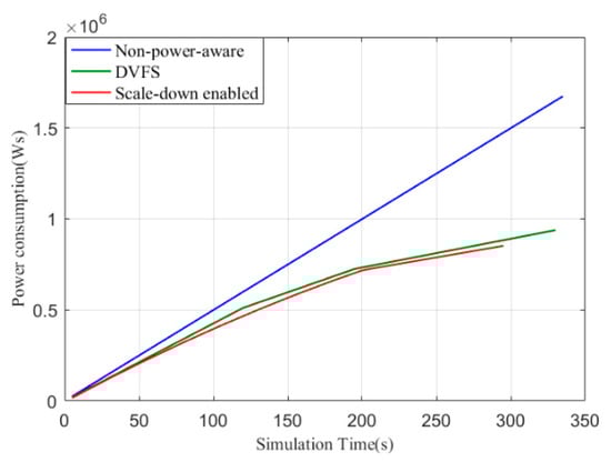 Figure 6 displays the power consumption of the cluster of the non-power-aware (default), DVFS, and scale-down algorithms. The default configuration consumes the most power, and the scale-down-enabled cluster shows the lowest energy consumption. DVFS requires a little more power compared with the proposed algorithm. The amount of energy consumption is associated with the number of active nodes and the processing time. The scale-down-enabled cluster with higher efficiency has fewer nodes and a lower execution time, which leads to energy conservation.