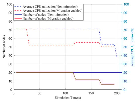 Average CPU utilization and the number of nodes in clusters with non-migration and migration-enabled policies.