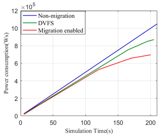 Figure 7 depicts the average CPU utilization and the number of nodes in a cluster with the non-migration (default) method and the proposed migration algorithm. Similar to what we mentioned before, we do not show the number of nodes or the average CPU utilization of DVFS here because they are the same as the default method. With respect to the default policy, the number of nodes was a constant value when we implemented the algorithm. The migration-enabled cluster also shows a decrease in number as the nodes finish their jobs. The average CPU utilization relates to both the number of active nodes and the CPU usage of each node in the cluster. When nodes are moved to a host with more CPU capacity (MIPS), the average CPU usage decreases. There is an increasing trend at around 120 s, which is when the nodes finish their jobs and release more available resources. It is important to point out that the execution time is reduced by moving tasks from inefficient nodes to efficient ones. To summarize, the migration-enabled policy is capable of decreasing the average CPU utilization and execution time. Furthermore, the power consumption of the given non-migration- (default), DVFS-, and migration-enabled clusters are presented in Figure 8.