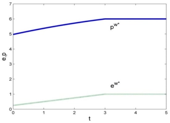 With Proposition 2, Figure 1 shows that both carbon emission and retail price initially become greater and then remain unchanged with the increase of carbon tax. Figure 1 demonstrates that, if , the optimal retail price is and the optimal emission reduction level is ; if , both the optimal retail price and the optimal carbon emission level increase with carbon tax. This happens when the carbon tax increases; the manufacturer’s cost also increases, which incentivizes it to curb product carbon emission and also indirectly results in the increase of retail price. On the other hand, if , the optimal emission reduction level remains unchanged. One way to explain this is that, if carbon tax is high, then the manufacturer is more willing to increase product’s carbon emission reduction to the initial level of carbon emissions. Meanwhile, the optimal retail price is identified as an unchanged because both the manufacturer and the retailer can maximize their profit. At the same time, the results in Proposition 3 are similar to those in Proposition 1.