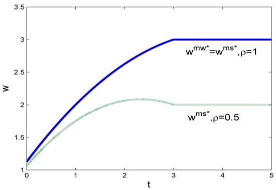 With Propositions 4 and 5, it can be known that, if , the optimal wholesale price in the MS is less than that in the MW; and, if , the optimal wholesale price in the MS and that in the MW are the same. Figure 2 depicts the curves of optimal wholesale price in different model with respect to carbon tax in different proportion of emission reduction cost-sharing. Obviously, the optimal wholesale price has a much steeper climb in the MW contract than in the MS contract. It can be concluded that, if the emission reduction cost becomes cheap, the manufacturer can utilize the MS because this can decrease the manufacturer’s cost. If the emission reduction cost becomes expensive, the manufacturer can utilize the MW because the manufacturer can directly offset the emission reduction cost by increasing the wholesale price.