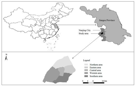 As the capital of Jiangsu Province and a central municipality of Eastern China, Nanjing is one of the four ancient capitals that has national historical and cultural importance. The city boasts nearly 2000 years of history, and is viewed as one of the most important birthplace of Chinese civilization. Nanjing has experienced rapid urbanization, increasing from 48.6% in 1978 to 81.0% in 2015, a growth rate 24.9% higher than the national average [64]. The focus of this study was the core area in Nanjing, which consists of five sub-areas that extend from east of the surrounding highway to south of the Qinhuai River, and west and north of the Yangtze River. The total area is approximately 375 km2 (Figure 1). Moreover, the basic topographic information is provided by the map with a gradual descent. The western part is relatively flat, while the eastern, southern, and northern part as mountainous and hilly (Figure 2).