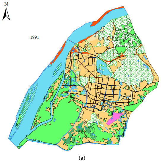Image registration of the RS images was performed via Erdas software. Combined with the administrative and topographic map, the images were cropped to obtain images of the study area. Interpretation marks were established according to the image features of different land use types combined with a field survey. Further, ArcGIS was conducted for visual interpretation, and ten land use categories characterized by a high degree of urbanization were used. The classifications included open spaces which include forest, tidal, water bodies (i.e., rivers, lakes, channels, ponds, and reservoirs), park and green land, arable, and bare land, and built spaces (i.e., built-up, transportation, industrial storage, military land) (Figure 3). According to field validation and accuracy testing, the accuracy of classification over the study period was determined to range from 84.01% to 93.13%, with an average of 87.84%, and the Kappa coefficient ranged from 0.77 to 0.82, with an average of 0.79 [65].
