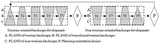 This study configured the two evolution stages based on Yu and Wang’s [59] model (Figure 4). Basically, if the PLAND of tourism landscapes increases while that of non-tourism landscapes decreases (i.e., the tourism value of the landscape increases), then the destination is in the tourism-oriented evolution stage. Conversely, if the PLAND of tourism landscapes decreases while that of non-tourism landscapes increases, then the material production function of the landscape, but not the tourism function increases. In this case, the destination can be described to be in a non-tourism-oriented evolution stage. Accordingly, urban tourism destinations can be categorized as growing, degenerated, and stable destinations [82].