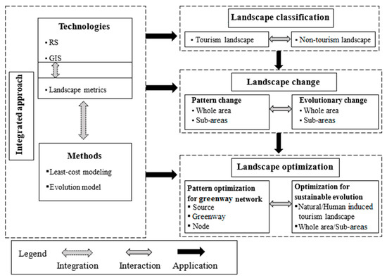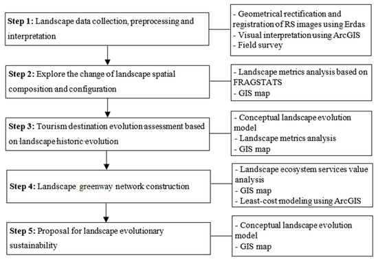 To further examine the aforementioned issue of landscape optimization in an urban tourism destination, a research framework was formulated based on an integrated approach. This approach allows identification of historical landscape changes, evolution, and optimization from the perspectives of urban ecology and tourism destination evolution (Figure 5).