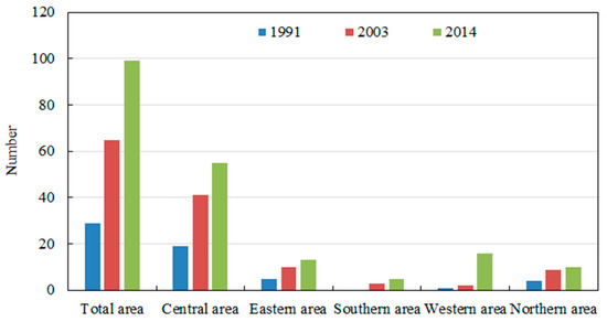 With respect to the sub-areas, from a quantitative perspective, most of the human induced tourism landscapes completed were concentrated in the central area, accounting for 65.51%, 63.07%, and 55.56% of the total area in 1991, 2003, and 2014, respectively (Figure 7). According to the field survey, 22 human induced tourism landscapes were constructed in the central area during the first dozen years, the PLAND of which was less than 0.5%. In comparison to the PLAND change in natural tourism landscapes in each sub-area (Figure 8), the PLAND of human induced tourism landscapes increased but could be ignored because of its relatively small value. Therefore, only the eastern area continued as a tourism-oriented landscape evolution destination, while all other sub-areas and the area overall converted from degradation to growth during the two research periods.