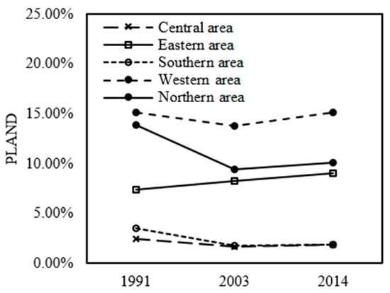 PLAND provides a general understanding of landscape composition, specifically the degree to which the landscape represents a particular patch type. The PLAND change in water landscapes were similar to the park and green land, which experienced a process of decline in the first stage (1991–2003), and then increased thereafter (2003–2014). The PLAND of tidal land rose slightly before 2003, and then declined rapidly, while forest exhibited a steady state before 2003 followed by an increasing trend. The PLAND of transportation land increased rapidly from 3.90% to 8.05% from 1991 to 2003, and then remained nearly unchanged, which reflects that the construction of the road network approached saturation recently. The PLAND of built-up landscape increased slowly during the first stage and rapidly in the next, and has become the dominant landscape type with improvement by more than 35% during the research period. The significant increase in transportation and built-up land depends highly on urbanization, and reflects its major achievements (Table 2).