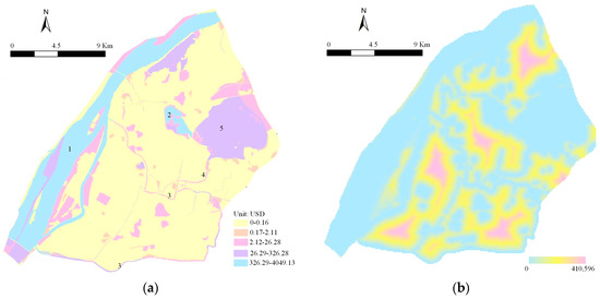Landscape spatial distribution. (a) Ecosystem services value; (b) Accumulative cost distance (Notes: 1. Yangtze River; 2. Xuanwu Lake; 3. Qinhuai River; 4. City Moat; 5. Zhongshan Scenic Area).