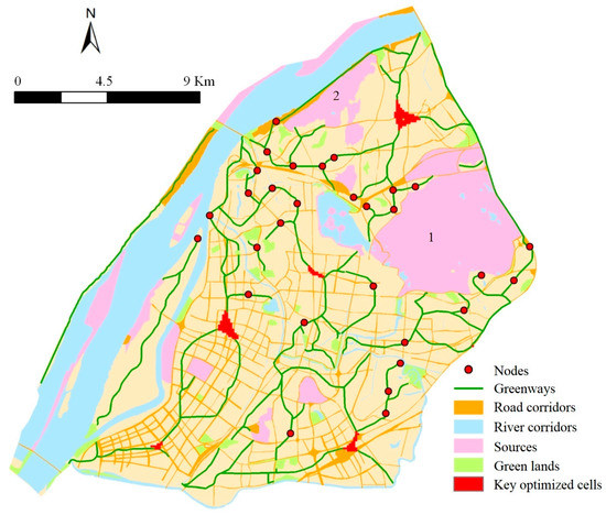 Ecological nodes are the key points that connect adjacent sources, and play an important role in landscape flow. They are especially important in a greenway network’s connectivity, and generally located along each greenway segment. Based on the landscape pattern feature and the accumulative cost distance surface in the research area, ArcGIS was used to set thresholds repeatedly by analyzing the intersections and discontinuities between the minimum and maximum cost paths in the landscape flow. Finally, the spatial distribution of landscape ecological nodes was obtained. As shown in Figure 10, a total of 30 nodes were established that connect the greenways among sources closely to form a complete greenway network.