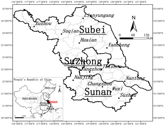 Location of Jiangsu Province, with its three sub-regions, in China.