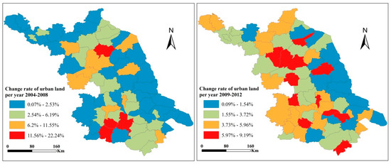 From 2004 to 2008, urban land increased by 9430 ha, with an average annual growth rate of 4.53%, while from 2009 to 2012 urban land increased by 23,350 ha per year, with a slightly lower annual growth rate of 3.92%. The rapid increase of urban land reflected the dynamics of the urban economy and urbanization in Jiangsu. Significant spatial variations in urban land development were observed at the county level. Higher urban land development was also observed mainly in the sub-region of Sunan, expanding to Subei and Suzhong, while more rapid changes in urban land development were mainly distributed in the counties and cities located in Subei, where the initial bases were lower but have had greater economic potential in recent years.