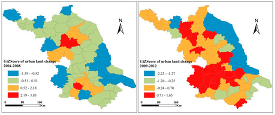 The observed values of G for urban land change were 3.32 × 10−2 and 3.02 × 10−2 in two study periods, 2004–2008 and 2009–2012, respectively (Table 2). Both were significant at p < 0.01, confirming that urban land development in Jiangsu exhibits significant spatial dependence. Z[G(d)] also showed that land expansion over the two study periods had positive spatial auto-correlations across Jiangsu. However, the Z-score decreased from 28.93 to 21.76, indicating the decreasing trend of spatial clustering in urban land development in Jiangsu.