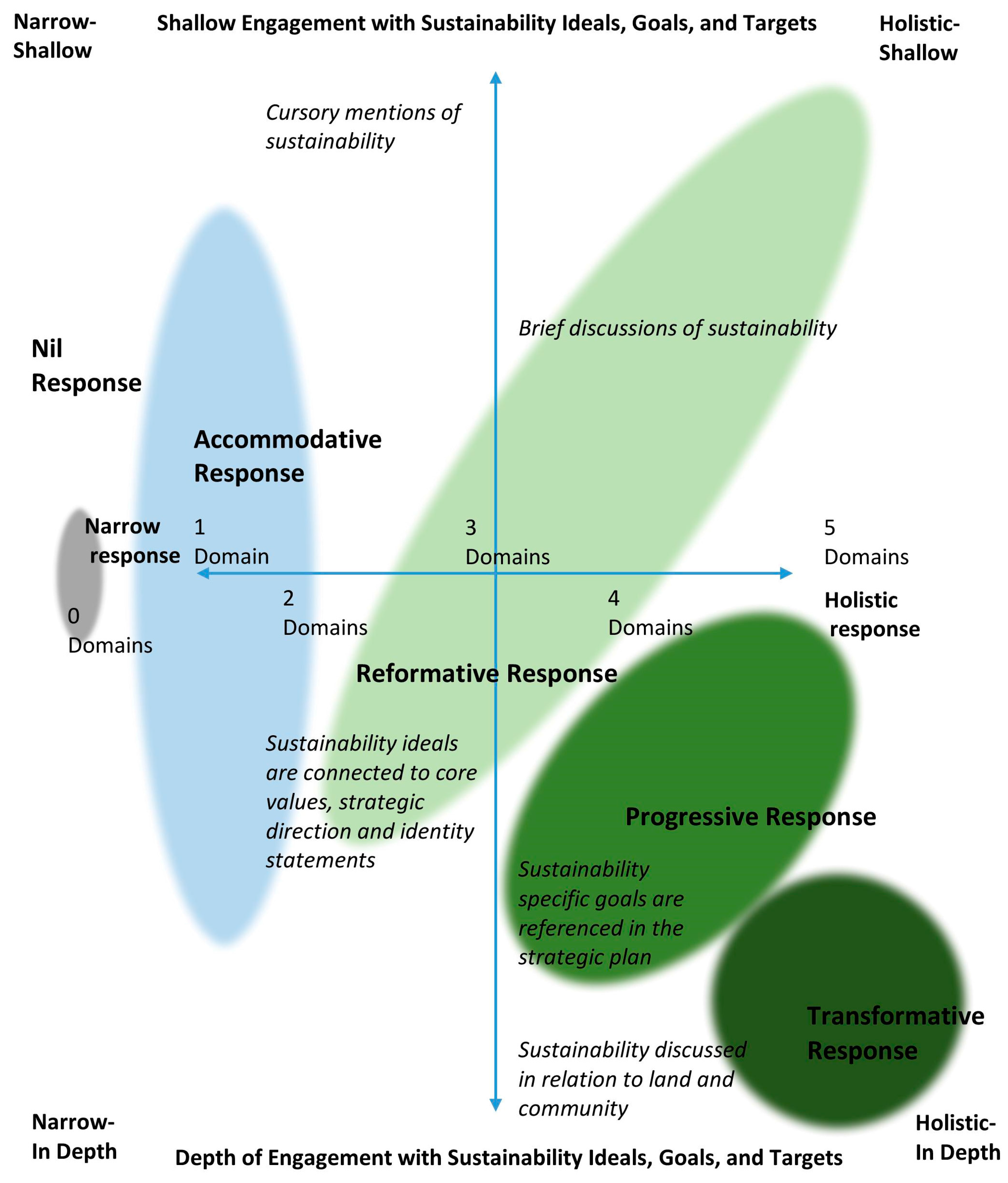 In order to analyze depth of engagement, we conducted an in-depth textual analysis of coding references for each institution in the sample. For each strategic plan we analyzed coding references across all domains in terms of sustainability terminology, inclusion of sustainability in mission statements, references to sustainability-specific policies and assessments, and inclusion of specific sustainability goals. This in-depth textual analysis of coding references and their context within specific strategic plans was undertaken via composition of analytic memos for each institution in the sample. Using the results from our matrix query and analytic memos, we created a summary table to illustrate whether or not sustainability was discussed under each of the five domains and the depth of sustainability content with regards to the abovementioned components. We used this summary table to categorize the ideal-type response to sustainability within each of the 50 institutions’ strategic plans, with reference to Figure 1 and Figure 2, as well as the criteria outlined in Table 1. As articulated in Table 1, we broke down accommodative, reformative, progressive, and transformative responses into subcategories based on different combinations of breadth and depth of content.