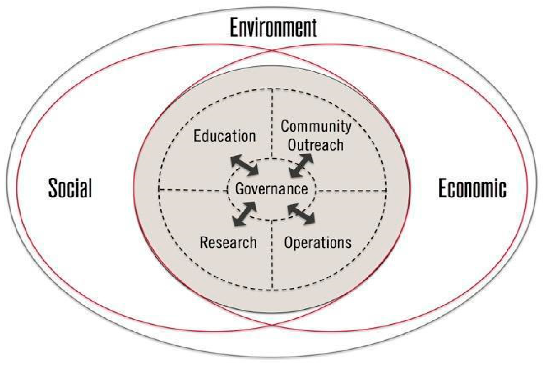 In Figure 1, we map possible nil, accommodative, reformative, progressive, and transformative responses to sustainability in strategic planning texts: from narrow to holistic engagement with sustainability domains on the horizontal axis and from shallow to deep engagement with sustainability values, goals, and policies on the vertical axis. In Table 1, we describe the types of response to sustainability that were analyzed in the strategic plans, including in relation to different combinations of breadth and depth of engagement with sustainability. We examined institutional responses to sustainability in relation to each of the five interacting domains of governance, education, campus operations, research, and community outreach (Figure 2). These five domains are aligned with the focus of the SHE literature on the need for holistic or whole institution approaches to campus sustainability that address the interconnections between education and campus operations, between governance and research, as well as other interactions that involve more than one domain of activity [2,12,14,37].