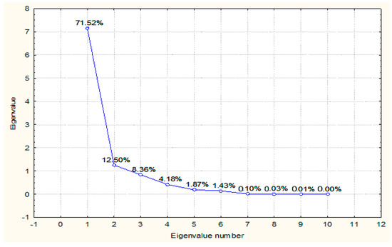In an algebraic view, principal components are linear combinations of the ten selected variables towards developing the GBFRT (, , …, ), whereas in a geometric setting, the linear combinations depict the choice of a new coordinate frame achieved by rotating the primary system with , , …, as the coordinate axes. Hence, the new axes signify the ways with the most fluctuation, while ensuring a straightforward and more parsimonious exhibition of the covariance pattern. Thus, the vector of variables picked out in order to substantiate the GBFRT, = (, , …, ), shows the correlation matrix ρ which registers ten eigenvalues ≥ ≥ … ≥ 0 [43].