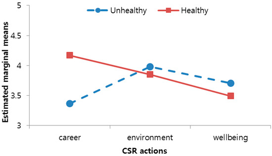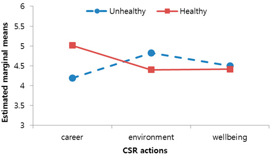 A two-way ANCOVA test revealed a significant interaction effect between CSR action types and food types (unhealthy vs. healthy) in adolescents’ emotional responses (F(2, 118) = 4.369, p = 0.015). We performed follow-up tests to determine the effects on adolescents’ emotional response more closely. As Figure 1 shows, we found a significant simple effect of food types (unhealthy vs. healthy) on adolescents’ emotional response under the career-related CSR action condition, and an insignificant simple effect under the environment-related and wellbeing-related CSR action conditions. When a restaurant that provides a career-related CSR program is selling relatively healthy food, respondents show higher emotional responses than when the food is unhealthy (Munhealthy = 4.195 vs. Mhealthy = 5.016; F(2, 118) = 6.919, p = 0.010). When a restaurant provides an environment-related program, respondents do not substantially distinguish the differences between unhealthy and healthy foods (Munhealthy = 4.825 vs. Mhealthy = 4.402; n.s.). Likewise, when a restaurant provides a wellbeing-related CSR program, respondents do not substantially distinguish the differences between unhealthy and healthy foods (Munhealthy = 4.497 vs. Mhealthy = 4.416; n.s.). Thus, hypothesis H2(a) was supported.