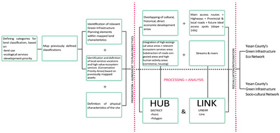 In brief, the methodology used was a definition of land categories and planning of such chosen features based on pre-existing law definitions. This then led to the identification of relevant natural assets that would form the ecological network at the same time that the definition of physical characteristics of the site added the vernacular part to the study. Then, the processing using GIS tools was done by overlapping the different cultural, historical, and social assets together with a set of ecological features for obtaining hubs and links of the network (Figure 1). The overarching method was the patch-corridor-matrix model [18]. According to Forman, landscapes are conformed by a series of patterns of patches, corridors, and matrices on land at different scales. These three landscape elements can be either manmade or created by nature. Patches represent larger and wider areas of natural land than that of corridors. In addition, ideally, patches should be of a rounded shape with several small, tentacle-like corridors for creating connections [3], although they can also be of larger or smaller scale, longer or rounder, and are considered the nodes where corridors coalesce [18]. On the other hand, corridors tend to be of a more elongated, linear shape that help connect the disperse patches along the landscape [18]. Together, patches and corridors form a matrix in the mosaics of the land in order to create an intertwined network.