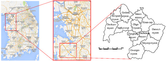 Yesan is a small industrial farming county located less than two hours away from Korea’s capital city, Seoul, in the western Chungcheong-nam Province (Chungnam) (Figure 2). Home to valuable ecological resources (e.g., the Yedang Reservoir and Muhan Stream), the county also includes several cultural assets such as Imjeong Fortress and Prince Namyeon’s Tomb. Despite its diverse character, Yesan’s population has notably decreased from 157,294 in 1975 to 77,000 in the present day, with an average percentage of depopulation of 26% every five years [19]. As depopulation represents one of Yesan’s main concerns, measures and policies to avoid the declining of the area are an urgent matter [20].