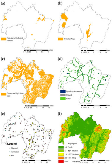 Yesan’s physiological characteristics: (a) First-Degree ecological features, which integrates areas with high ecological value; (b) Protected Areas, areas with wildlife and hydrological resources worthy of protection; (c) Forestry and agriculture areas, comprised of forest-protected lands and farmlands; (d) Hydrological resources, which includes rivers, wetlands and a 100 m buffer around them; (e) Roadkill information, conjoint information of mammal, amphibian, and bird population roadkill incidents; and (f) Slope, Yesan’s slope divided into five classes.