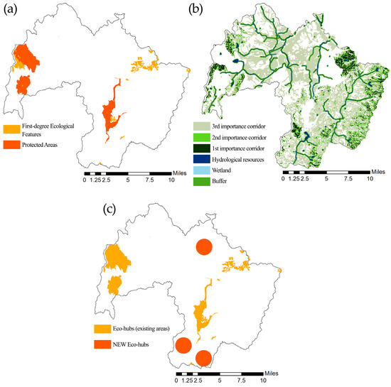 (a) Yesan Eco Hubs, comprised of the First-Rank Ecological Features and the Protected Areas; (b) Green Corridors, with the three levels of corridors’ importance and Hydrological Resources; and (c) Yesan’s New Eco Hubs, defined by roadkill information data.