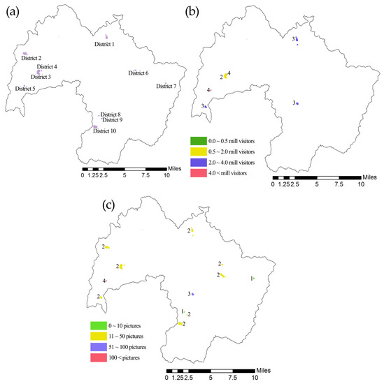 The proxies used were Park Visitation [26] along with the mapping of the Cultural Assets and Touristic Spots. This gives us crucial information about the collective importance of a site by measuring the number of people who are interested in visiting such an area. The number of visitors in touristic and cultural attractions in Yesan was obtained through the Touristic Information System [27].