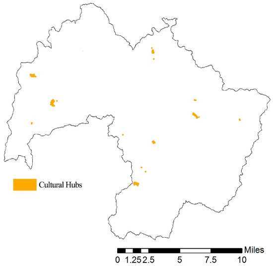 As for the socio-cultural characteristics, the different methods of data procurement resulted in 13 main socio-cultural spots that formed the Cultural Districts and Culture Hubs for the Yesan GI Network (Figure 7). These areas are directly linked to diverse cultural assets that form part of Yesan’s history, and are also linked to particular ecological characteristics, especially thanks to the different feng shui used at the time of their construction.