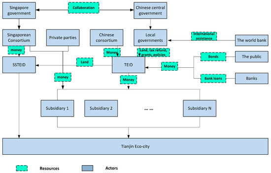 SSTEC is developed as a cooperative initiative between Chinese and Singaporean enterprises, upon the active invitation of the Chinese and Singaporean governments. TEID and SSTEID are its key developers. TEID obtains its investments from a Chinese consortium (led by TEDA Investment Holding Co. Ltd. (Tianjin, China)), which is responsible for land acquisition and preparation, investment, construction, operation and maintenance of infrastructure [53]. SSTEID receives its financial input from both a Chinese and a Singaporean consortium (led by the Keppel Group) with a total investment of CNY 4 billion, each party taking up 50% of the total investment, aiming to catalyze large-scale urban solutions [54]. The Chinese consortium used the land use rights as its initial investment while its Singaporean counterpart injected cash.