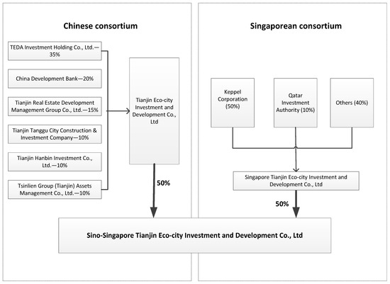 To bypass the legal constraints (According to the Budget Law of the People’s Republic of China issued in 1994, local governments are not allowed to issue local government bonds, except as otherwise stipulated by law or the State Council.) of China’s ‘Budget Law’ on local governments, local governments usually founded special purpose vehicles to help them raise money for the construction of industrial parks, software parks or large-scale infrastructure in the past few decades [37]. This practice makes local governments accountable for the debts and hence increases the financial pressure on them. The foundation of TEID has generated enormous change in both the ownership structure and company operations, adjusting the ‘government-invested and government-dominant’ financing model into something more complex. In terms of the ownership structure, TEID obtains investments from six Chinese enterprises led by TEDA Investment Holding Co., Ltd. with a registered capital of CNY 3 billion. In terms of shareholder structure, the Chinese consortium, as shown in Figure 3, consists of six shareholders, including TEDA Investment Holding Co., Ltd. (35%), China Development Bank (On 18 December 2009, TEID held its 8th shareholders meeting. The shareholders meeting passed the resolution to transfer all 20% shares held by China Development Bank to China Development Bank Capital Co., Ltd. (Beijing, China) TEID completed the alteration of the registration particulars in Tianjin Administration for Industry and Commerce in 2010.) (20%), Tianjin Real Estate Development Management Group Co., Ltd. (15%), Tianjin Tanggu City Construction & Investment Company (10%), Tianjin Hanbin Investment Co., Ltd. (10%), and Tsinlien Group (Tianjin) Assets Management Co., Ltd. (10%). On the one hand, this form disperses the company’s ownership, which prevents it from being a financing vehicle for local government. On the other, although all six companies are state-owned, they are strongly interwoven with each other. This ownership structure separates local governmental from enterprise functions, which is helpful for the marketization of enterprises and expected to improve economic and decision-making efficiency.