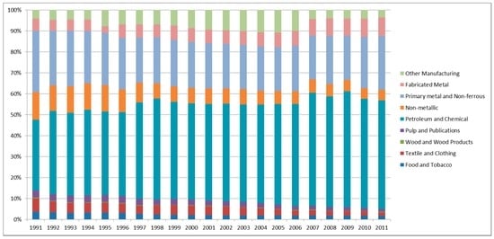 Figure 1 shows the proportion of changes in energy consumption for each industry in Korea’s manufacturing sector for the period of 1991–2011. Petroleum and chemical accounted for the largest share of energy consumption, followed by primary and nonferrous metal, fabricated metal, and non-metallic. By 2011, petroleum and chemical and primary and nonferrous metal accounted for 52.01% and 24.55% of the total energy consumption by the manufacturing sector, which is a total of 76.56%.