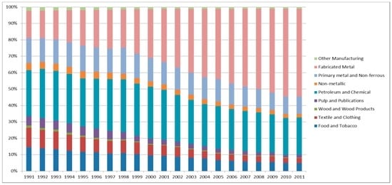 A comparison of Figure 1 and Figure 2 reveals certain differences between energy consumption and production structures. The petroleum and chemical industry accounted for the largest proportion of energy consumption but is followed by the fabricated metal industry in the proportion in production for 2011. The fabricated metal industry accounts for the largest share of production, but is followed by the petroleum and chemical and primary and non-ferrous metal industries in terms of energy consumption. In other words, energy intensity varies by industry, and the industrial structure has undergone several changes over the past 20 years. The LMDI analysis suggests that these changes may have resulted from changes in the structure, intensity, and activity effects.