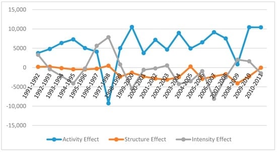 As mentioned earlier, the changes in total energy consumption in the manufacturing industry were decomposed based on three elements. The first element is the activity effect, in which energy consumption increases with an increase in production (Q). The second element is the industrial structure effect, which describes the changes in total energy consumption as the proportion of each industry in total production changes (. It implies that an increase or decrease in the relative size of sectors can affect the energy consumption of the manufacturing sector. The third element is the intensity effect, which is caused by an improvement in the proportion () of energy used for production in industry i.