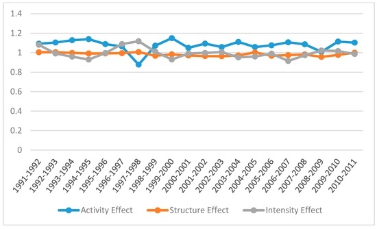 Table 5 and Figure 4 provide the multiplicative factor decomposition results of the increase in energy consumption for each year in comparison to the corresponding previous year. For example, the results from 2010 to 2011 can be interpreted as follows. Total effect is 1.0872, which means that energy consumption increased by 8.72% in 2010–2011. As regards decomposition, it increased by 10.30% due to the activity effect, and decreased by 1.4% due to the intensity effect and 0.0004% due to the structure effect. The total effect can be calculated by multiplying the values of each individual effect. The value of the total effect is greater than one because the activity effect is larger than the intensity and activity effects.