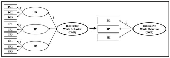 In regard to any indications of possible improper solutions of the CFA model of innovative work behavior, the results revealed that all factor loadings and path coefficients in the model were statistically significant (|t| > 1.96, p < 0.05). In addition, all signs and magnitudes of parameter estimates in the model made sense as there were neither negative error variances nor out-of-range (i.e., r < 1) findings, while the standard errors were also reasonable. Taken together, it can be assumed that there were no indications of possible improper solutions. Thus, this study uses the parceling model of innovative work behavior as shown in Figure 1 [68].
