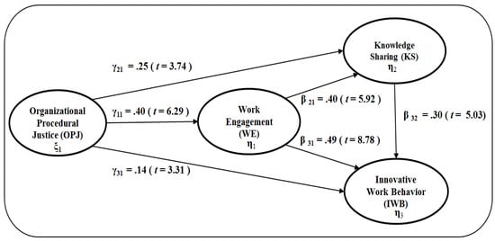 According to Preacher and Hayes [69], the bootstrapping approach is the most powerful test method for specific indirect effects under most sample conditions and utilizes a non-parametric re-sampling procedure without a normal distribution assumption of variables. Furthermore, since Preacher and Hayes [69] strongly recommended the bias-corrected (BC) bootstrapping procedure, the current study tested the mediating effects through the BC bootstrapping procedure with 1000 bootstrap samples. The results of the bootstrap estimates are presented in Table 4. The results demonstrate the statistically significant mediating effects of work engagement in the relationship between organizational procedural justice and the innovative work behavior of employees (completely standardized estimate of the mediating effect, ab = 0.196, p < 0.01, 99% confidence interval, CI (0.115, 0.278)) as well as also the relationship that exists between organizational procedural justice and employee knowledge sharing (ab = 0.159, p < 0.01, 99% CI (0.082, 0.236)). In addition, the results of the bootstrap estimate show that the standardized mediating effect of knowledge sharing in the relationship between organizational procedural justice and employee innovative work behavior (ab = 0.075, p < 0.01, 99% CI (0.018, 0.133)) was statistically significant. Furthermore, the results reveal that the multi-mediating effects of work engagement and knowledge sharing in the relationship between organizational procedural justice and the innovative work behavior of employees (ab = 0.048, p < 0.01, 99% CI (0.014, 0.082)) were statistically significant. Taken together, hypotheses 4 and 5 were supported. Therefore, all research hypotheses proposed in this study were supported by the data.