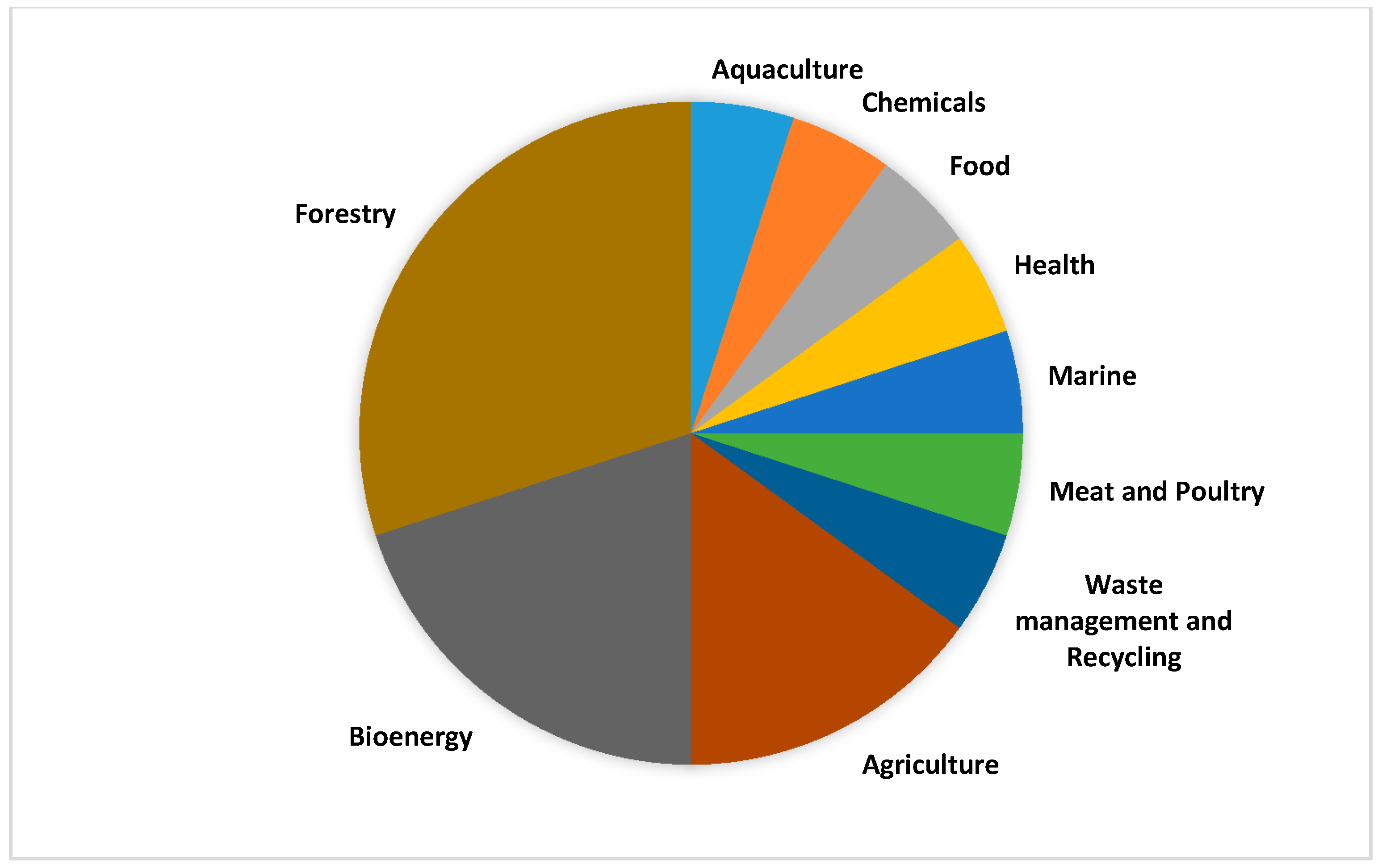 Regarding the participating actors, we find that more than half of the submissions were from industry associations or private firms, followed by an even distribution of other actor groups representing public authorities, academia, and environmental and social NGOs. When further dissecting the private sector group, we find that they represent a multitude of industrial sectors ranging from forestry to bioenergy, agriculture, waste management and recycling, meat and poultry, marine, health, food, chemicals, and aquaculture (Figure 1). Among these sectors, the forestry sector clearly dominates, followed by bioenergy and agriculture.