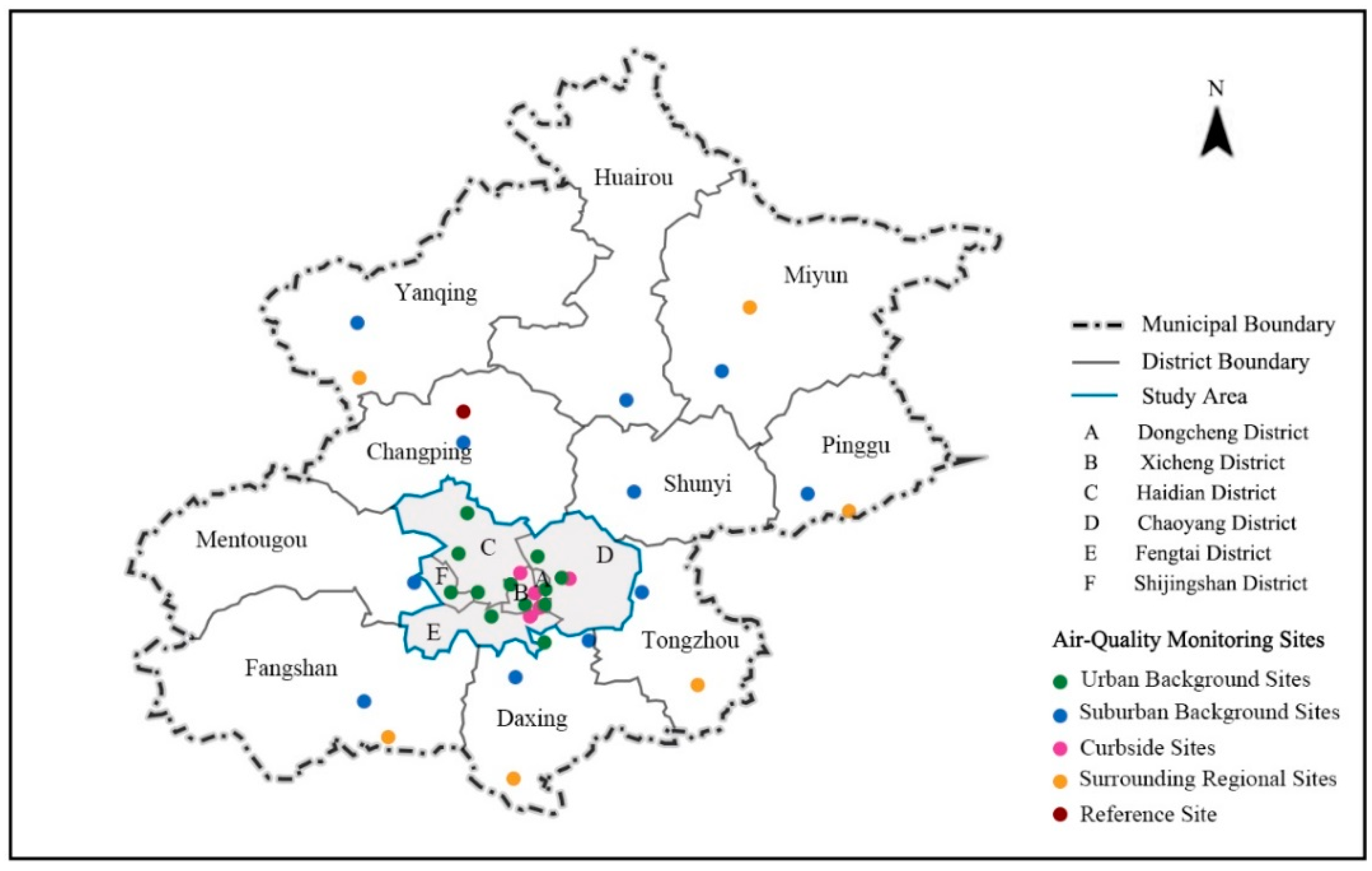 The distribution of air-quality monitoring sites in Beijing (Source: by Authors).
