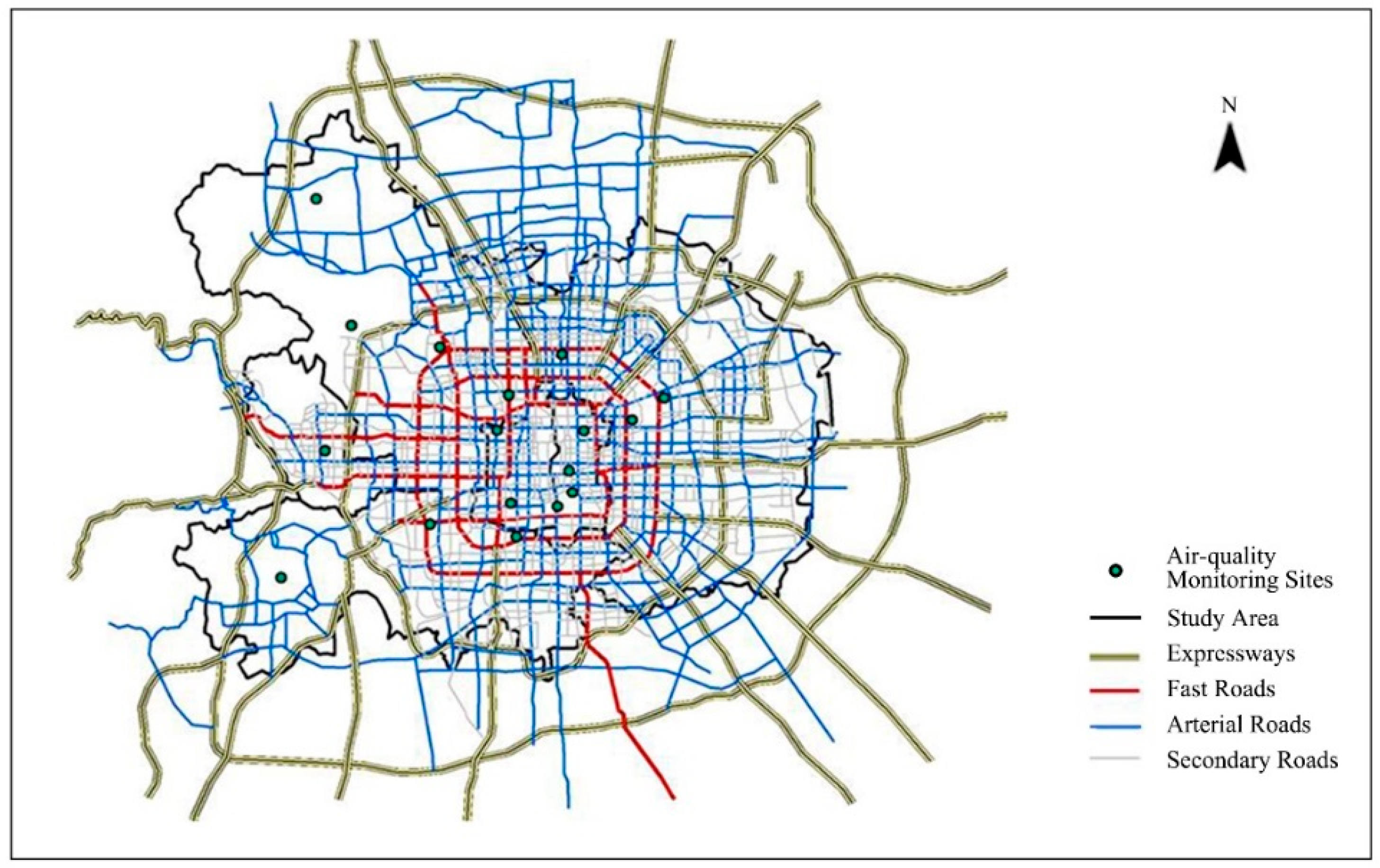 The differences in traffic monitoring programs in urban areas result in variable types of traffic indicators. If cars and trucks are systematically enumerated, then variables reflecting traffic intensity can be generated. However, if traffic counts do not exist, then road classifications can be used as a surrogate, because road classification can reflect traffic volumes at a certain level. The higher the road level is, the larger the traffic flows are. Henderson et al. attempted to assess whether a similar LUR model could be obtained from the two different sets of traffic variables—traffic volume and road patterns. All of these results suggest that models built with road length and vehicle density metrics, are equally able to explain the variability in pollutant concentrations. This finding confirms that valuable LUR models can be developed in the absence of traffic count data, which are unreliable or nonexistent in many areas [37]. Many other scholars have also used road patterns to build LUR models [47,48]. Since it is difficult to collect the traffic flow data in Beijing, road classifications were selected in this study. During further research, roads were divided into five classes, including expressways, fast roads, arterial roads, secondary roads, and branch roads (Figure 2). The corresponding data come from the Master Planning of Beijing (2004–2020) [49] and Beijing Traffic Tourism Map (2015) [50].