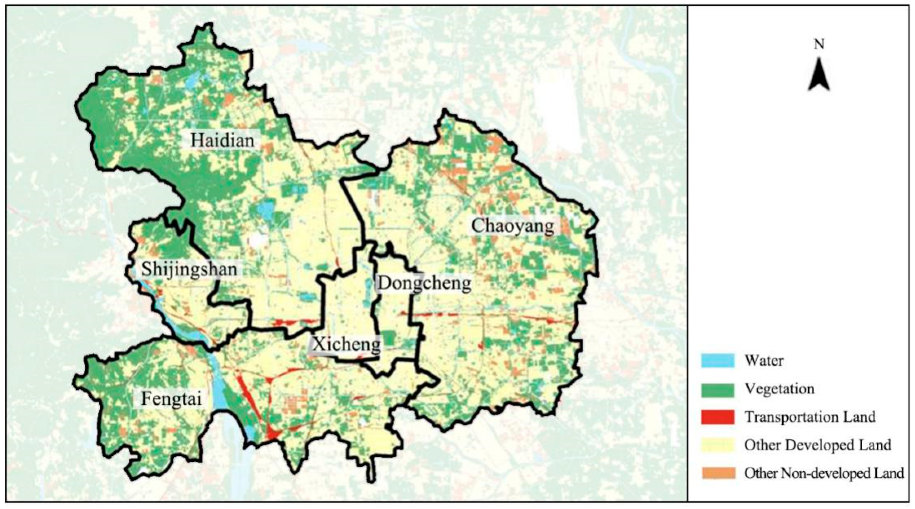 The land-use map of Beijing in 2014 was compiled by the Beijing Municipal Institute of City Planning & Design, which was then combined with the satellite imagery of Google Earth to obtain the land-use map of the study area in 2015. According to the Code for classification of urban land-use and planning standards of development land, and its positive and negative influences on PM2.5, land is divided into five types, including water, vegetation, transportation land, other developed land, and other non-developed land (Figure 3, Table 1). It is particularly worth mentioning here that, because the impact of traffic on PM2.5 concentrations is measured by the lengths of different roads, the land represented by road is not included in transportation land.
