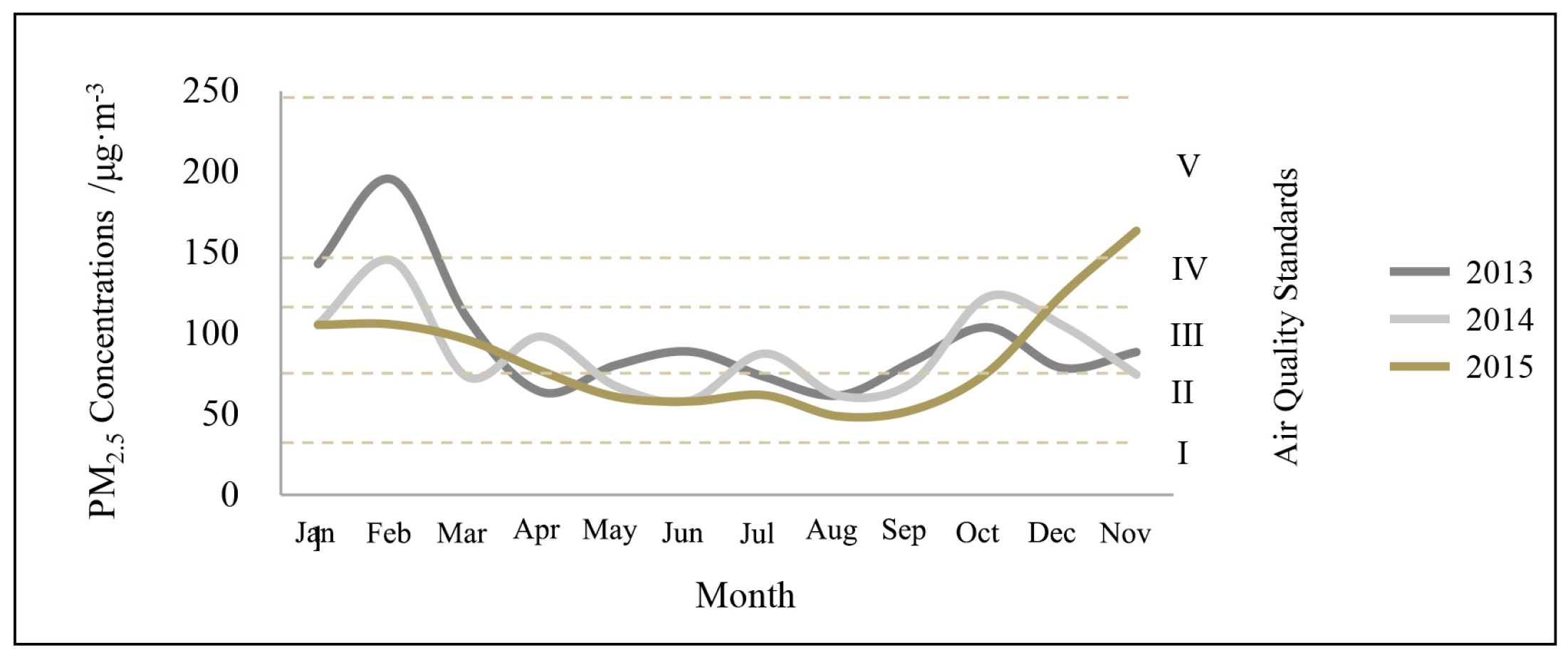 Monthly mean concentrations of PM2.5 in the study area (2013–2015). The latest China National Ambient Air Quality Standards for PM2.5 are: I. Excellent, 0–35 μg/m3; II. Good, 35–75 μg/m3; III. Slight pollution, 75–115 μg/m3; IV. Moderate pollution, 115–150 μg/m3; V. Heavy pollution, 150–250 μg/m3; VI. Extremely heavy pollution, above 250 μg/m3 (Source: by Authors).