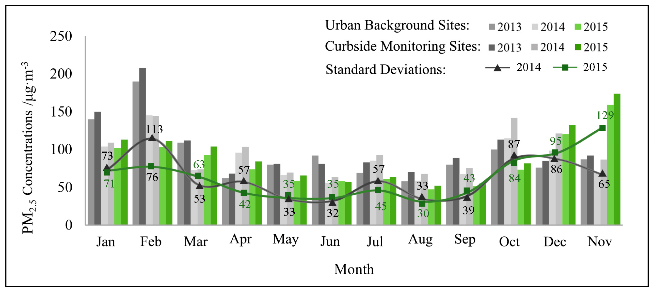 According to the records (Figure 5), PM2.5 concentrations around curbside monitoring sites (the annual average concentrations of PM2.5 for 2013, 2014, and 2015 were 103, 96, and 91 μg/m3, respectively) were higher than those around the urban background sites (the annual average concentrations of PM2.5 for 2013, 2014, and 2015 were 95, 86, and 83 μg/m3, respectively), due to road dust and emissions from vehicles. The standard deviations of PM2.5 concentrations during each month were high, indicating that PM2.5 pollution might suffer a significant volatility in a short period of time, as a result of Beijing’s peculiar geographical locations, meteorological conditions, and the emissions of pollutants.