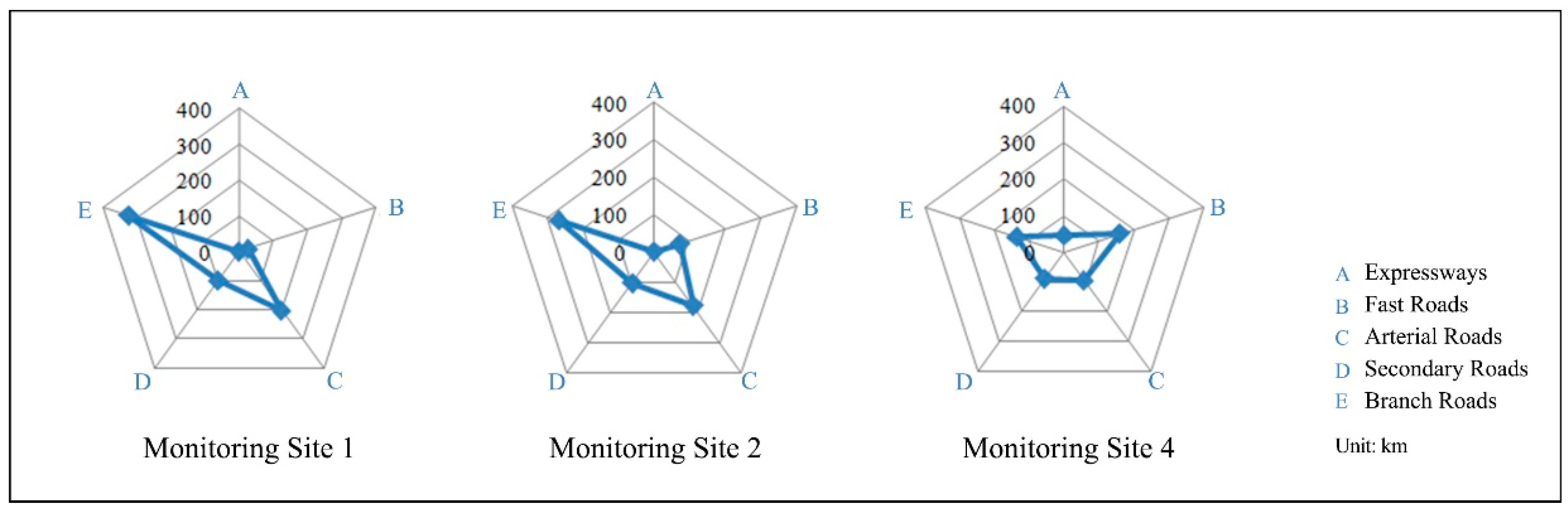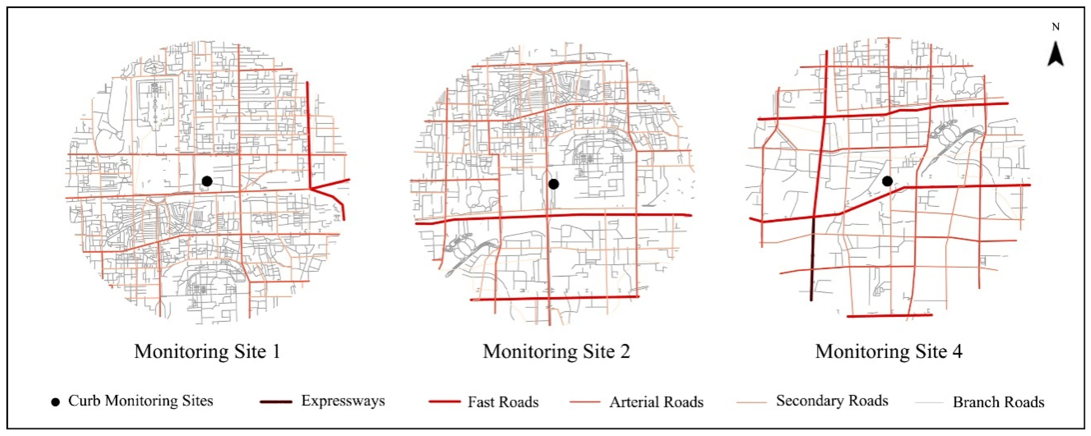 There are significant differences in the road network of the three monitoring sites (Figure 8 and Figure 9). When considering the road density, the following relationship can be seen: monitoring site 1 > monitoring site 2 > monitoring site 3. With regard to the road grade structure, both monitoring sites 1 and 2 are mainly dominated by branch roads and secondary roads, while monitoring site 4 features a relatively uniform network structure, with an expressway also running around it. As for the layout of the road network, the network near monitoring site 1 shows a relatively high-density grid pattern, with the main streets forming a fishbone shape, while the network near monitoring sites 2 and 4 shows a relatively low-density grid pattern, with the road in the north being denser than that in the south.
