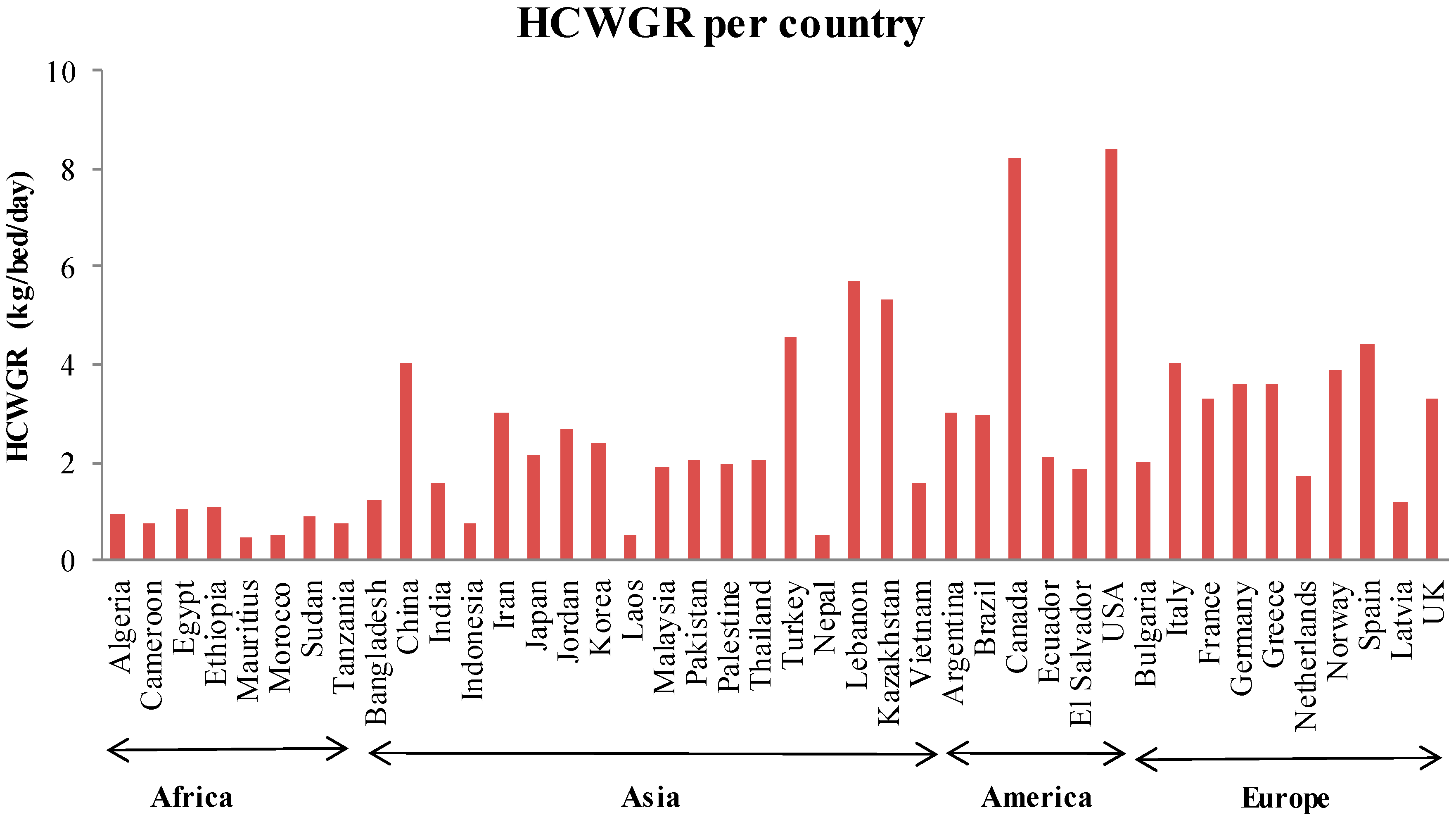 The HCWGR reported in Table 1 include the hazardous and non-hazardous fractions of HCW. It is mentioned, however, that China, Korea, Lebanon, Argentina, El-Salvador, Bulgaria, and Greece provided information only for the hazardous fraction of HCW. According to WHO estimation, approximately 80% of the total HCW stream consists of the non-hazardous (urban) fraction [1]. The total HCW (hazardous and non-hazardous) for those seven countries was calculated by taking into account that percentage so as to be able to compare all 42 values together.