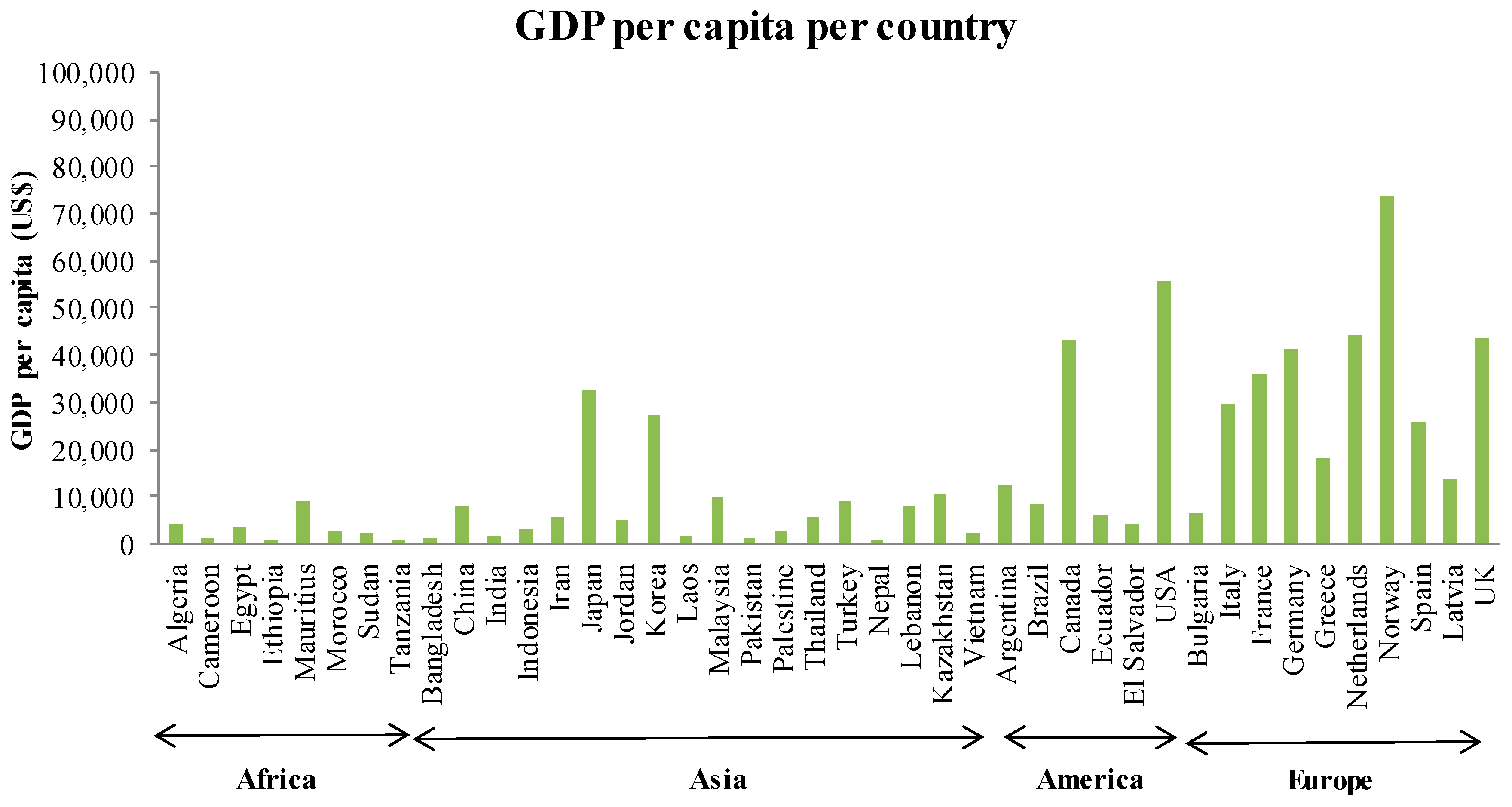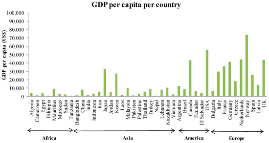 - GDP per capita (US $/capita). This is the gross domestic product (GDP) converted to dollars using purchasing power parity rates. GDP at purchaser’s prices is the sum of gross value added by all resident producers in the economy plus any product taxes and minus any subsidies not included in the value of the products [39]. Data were based on the 2015 calendar year.