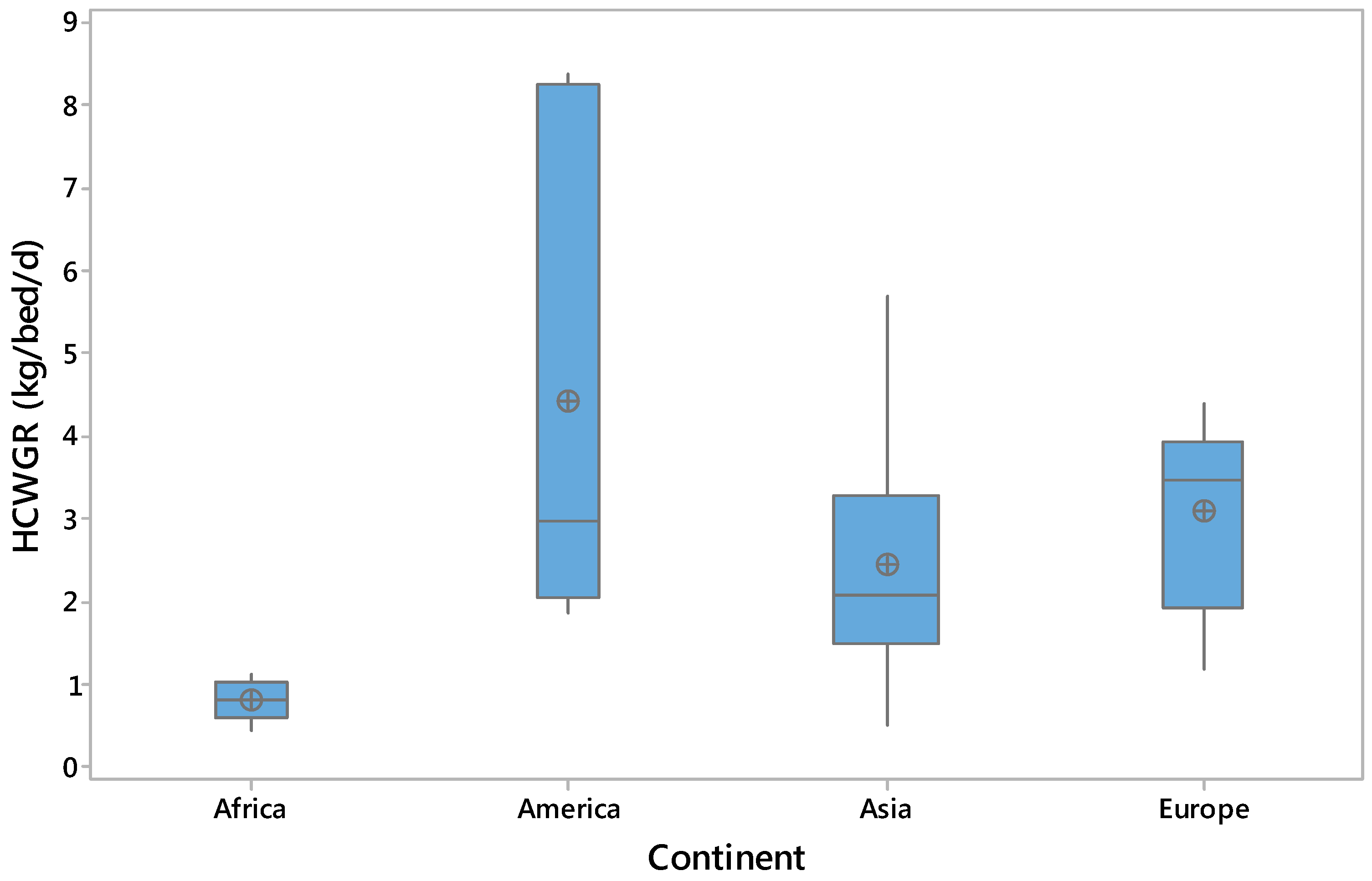 The normality of the dependent variable (HCWGR) was examined using both a graphical depiction (boxplots) and by applying the Anderson-Darling (AD) normality test per continent (see Table 2). Figure 3 illustrates the boxplots of the data per continent. The mean values are indicated with the symbol (circled cross). According to Figure 3, the HCWGR values from America and Asia are slightly skewed to the right. Using a threshold p of 0.05, the results from the AD test indicate that values from Africa, Asia, and Europe are normally distributed, whilst values from America and the overall values are not. The lack of normality for the HCWGR from America is practically attributed to the outliers of USA and Canada (since both countries had HCWGR above 8 kg/bed/d). These outliers were not removed from the overall data during subsequent analysis.