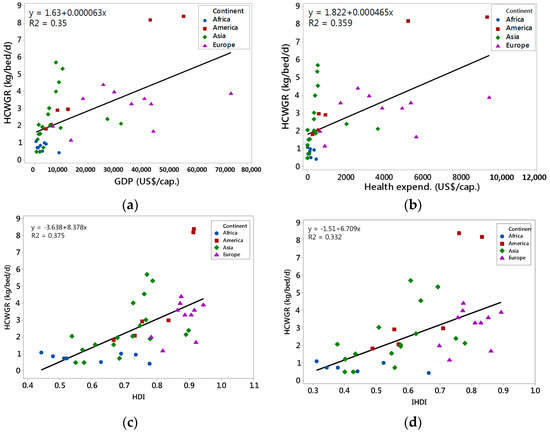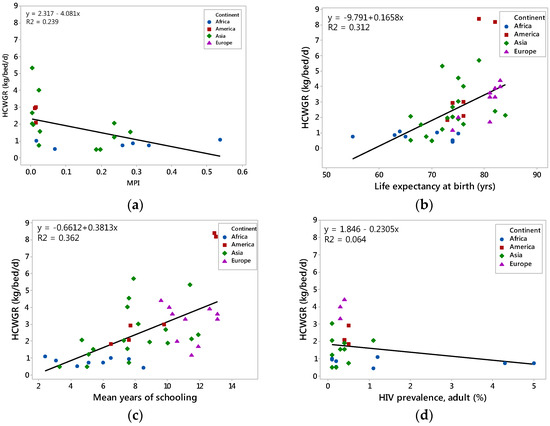 Figure 4, Figure 5 and Figure 6 reveal that there is a positive correlation between HCW generation rates and GDP, HE, HDI, IHDI, life expectancy, mean years of schooling, and CDE (R2 = 0.35, 0.359, 0.375, 0.332, 0.312, 0.362, and 0.574, respectively). With regard to GDP and HE (which is a percentage of GDP), a rather reasonable explanation for this positive correlation can be provided. As the quality of healthcare services increases, more medical equipment and medical consumables are purchased, more patients are treated and, thus, more HCW are generated. Similar findings had been found by Windfeld and Brooks (2015) [7], who had also showed a positive correlation between HCWGR and the GDP and HE. In that case, the coefficients of determination were statistically significant and equal to 25.7% and 34.9%, respectively.