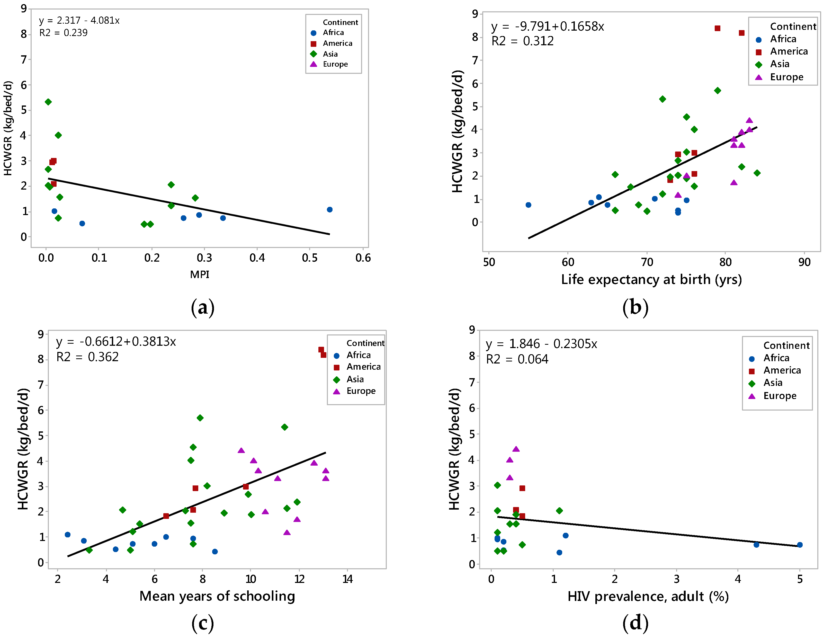 Linear regression models of HCWGR vs. (a) MPI; (b) life expectancy at birth; (c) mean years of schooling; and (d) HIV prevalence. The regression line was constructed from all data.