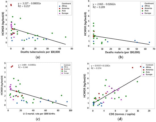 Linear regression models of HCWGR vs. (a) deaths due to tuberculosis; (b) deaths due to malaria; (c) U-5 mortality rate; and (d) CDE. The regression line was constructed from all data.