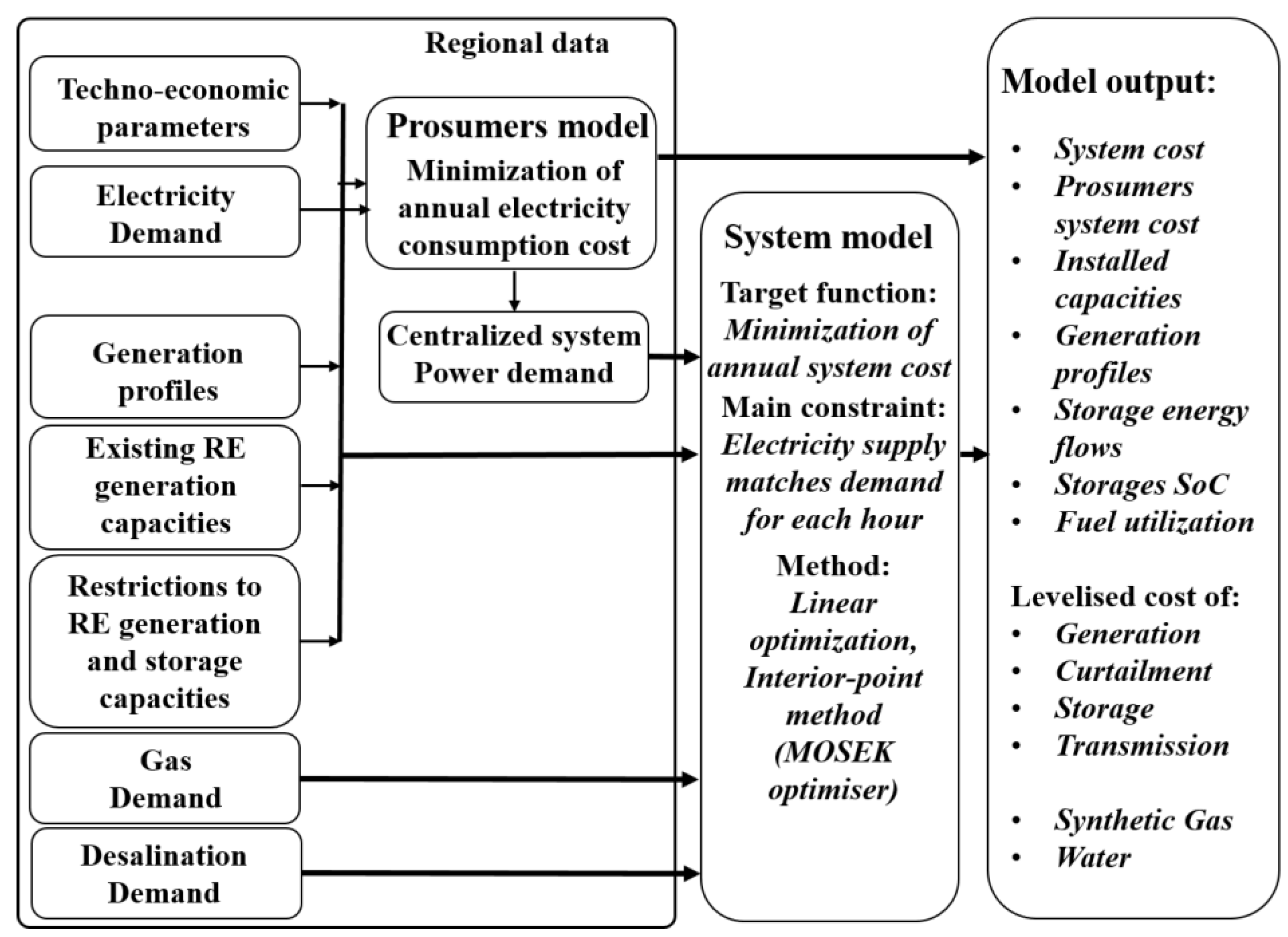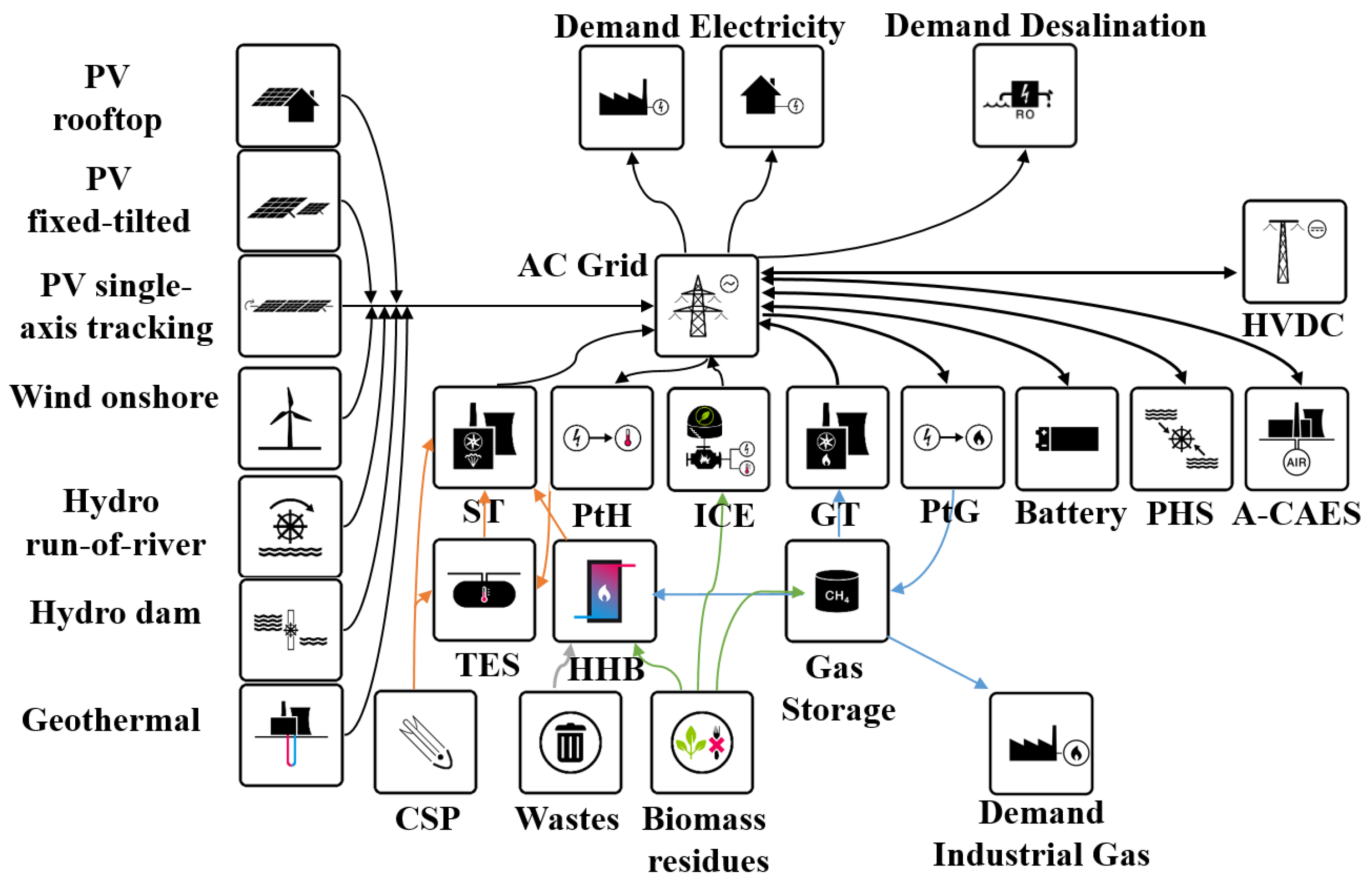 Table 1. However, none of them considered the approaches applied in this study, such as an hourly-based model that guarantees that the hourly total electric energy supply in an entire year in the sub-regions covers the local demand from all sectors; different transmission grid development levels that are able to reduce the need for energy storage and total costs; and an integrated scenario that assumes electricity demand, water desalination, industrial gas demand, and a renewable energy (RE)-based synthetic natural gas (SNG) trading.