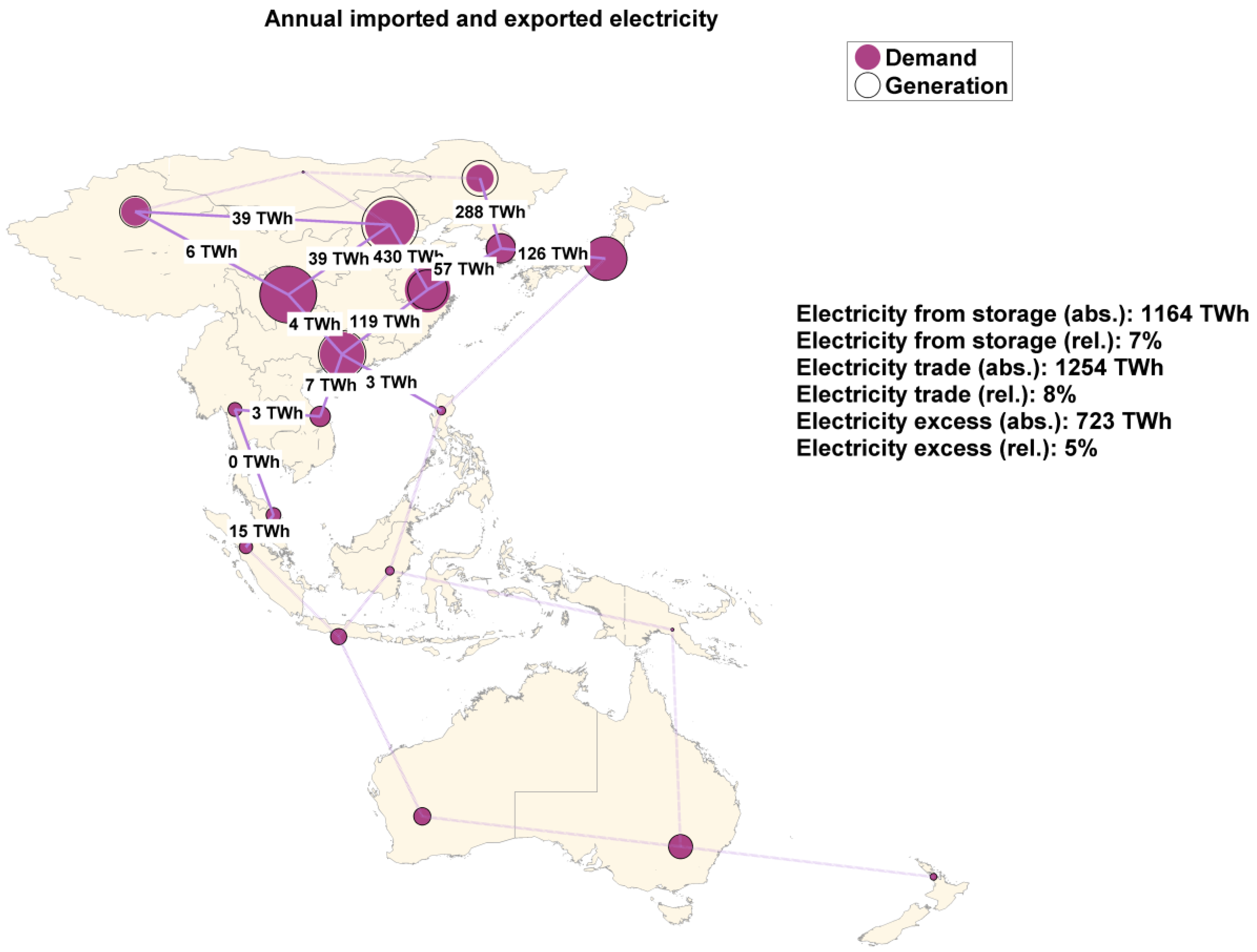 The impact of connecting different regions with HVDC power lines can be observed in the decrease in the total levelized cost of electricity. The integration of SEA and NEA does not create any substantial additional benefit to the system, since the costs are reduced by 0.4%–0.7%, depending on the scenario. The impact is limited to regions that are not far apart and where local storage technologies are more expensive than the transmission of electricity. Due to long distances and local storage technologies being more cost-competitive, low-cost RE from Australia cannot be exported to high demand centers in Indonesia and further into China due to high transmission costs. The increasing cost competitiveness of storage compared to grids had already been found for Northeast Asia [