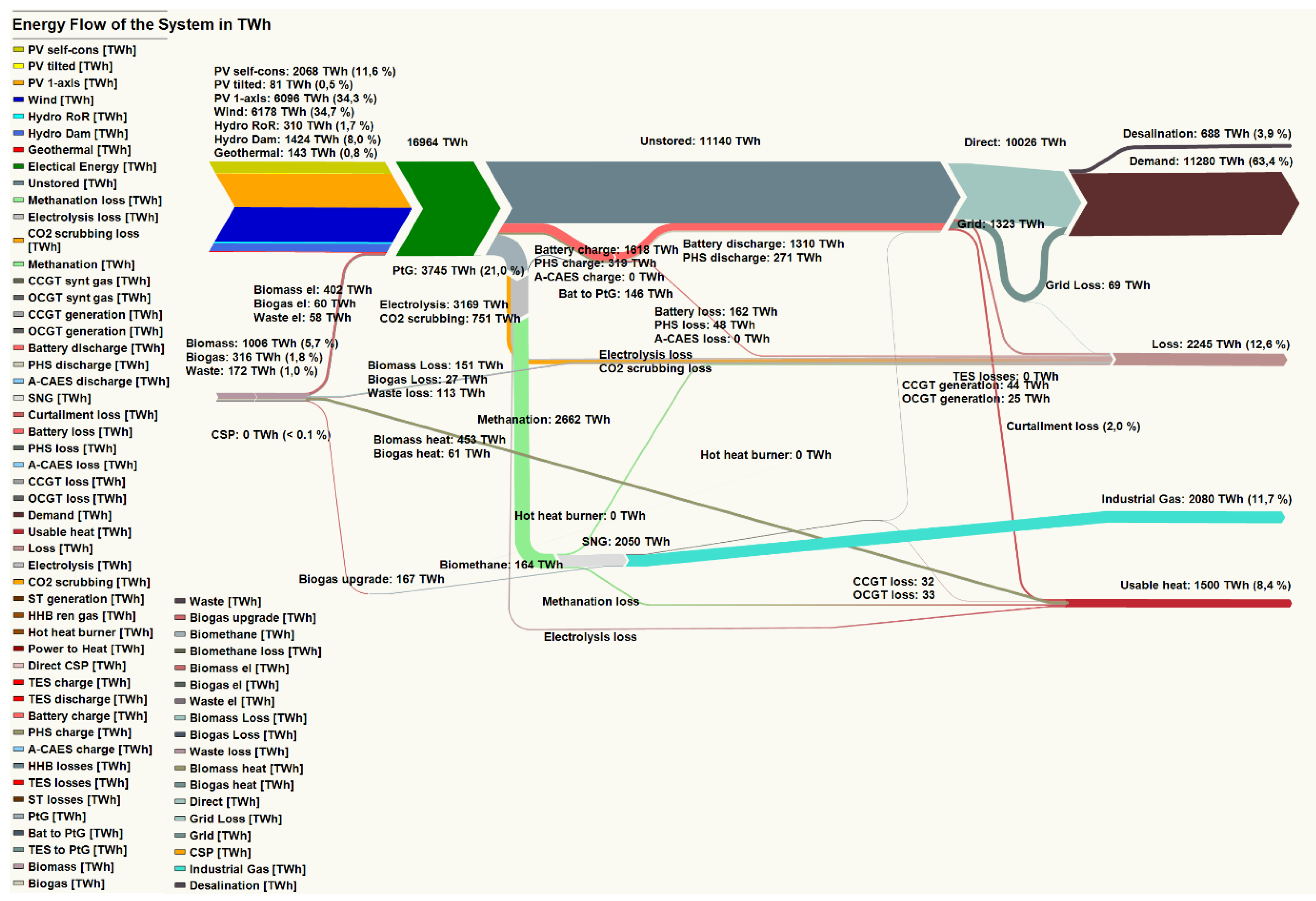 The excess heat generated by the system as a byproduct of various processes such as biogas and biomass CHP plants, waste-to-energy incinerators, gas turbines, electrolyzers ,and methanation plants could be used to meet the heating demand in the industrial sector. Also, the excess electricity curtailed by the system could be converted to heat, stored in heat storage, and utilized to meet the heating demand. For the area-wide scenario the usable heat generated is 1095 TWhth per year, and for the integrated scenario it is 1500 TWhth per year. The higher usable heat in the integrated scenario is due to a higher absolute curtailment of electricity. The waste heat generated as a byproduct of biomass and biogas plants is evenly distributed over the year.